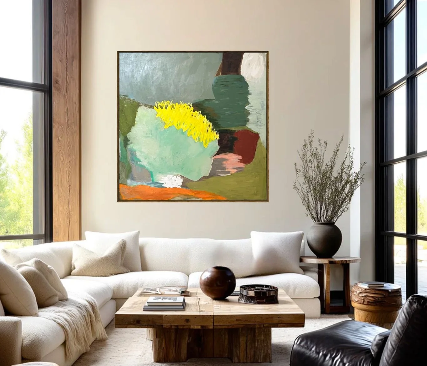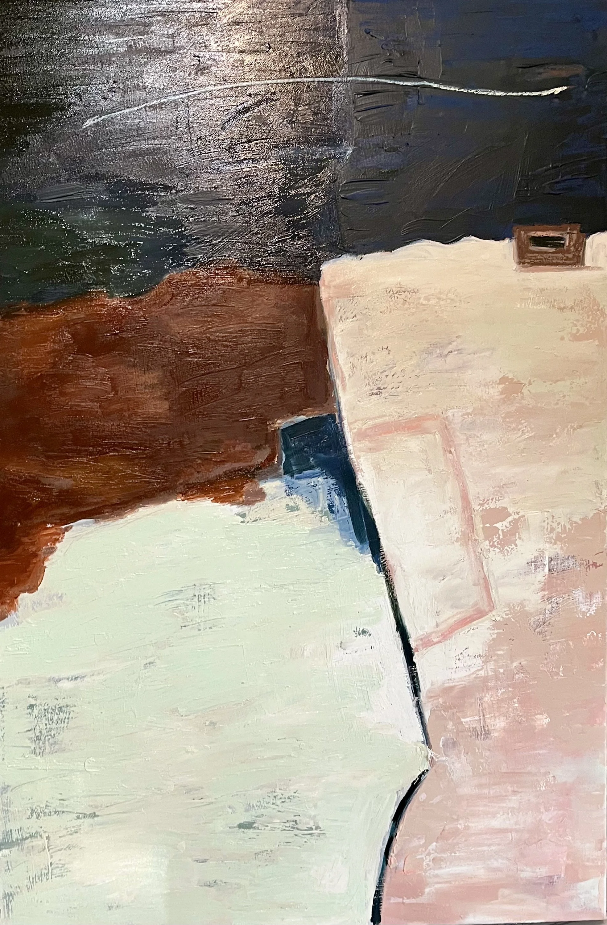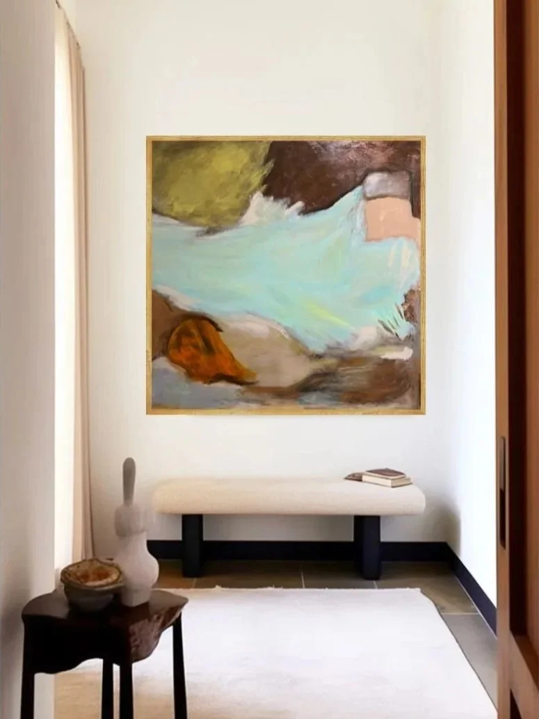 This dynamic abstract painting series reveals the raw energy of shifting landscapes through bold, sweeping gestures and a rich, earthy palette and surprising pops of color. Layers of deep browns, warm ochres, and luminous turquoise blend into fluid forms that suggest crashing waves, eroded cliffs, and distant skies. The composition feels alive with movement — a powerful interplay of light and texture that invites the viewer to lose themselves in its atmospheric depth.
